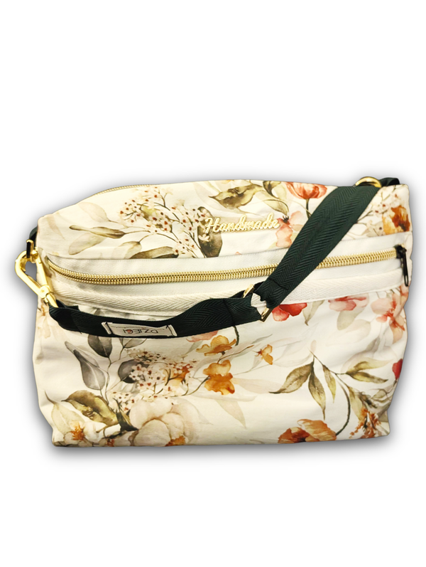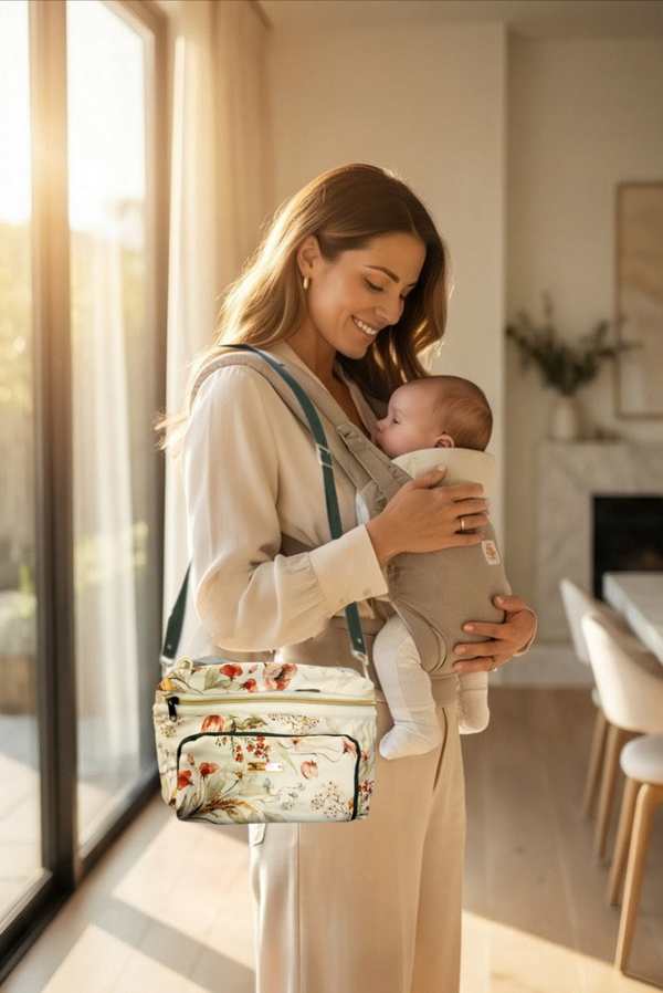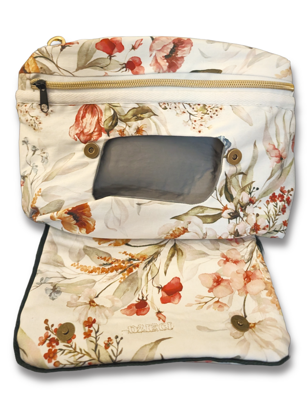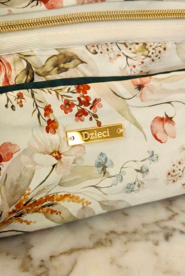 The Dzieci Original Nappy Bag is a luxury compact baby changing bag that combines style and practicality. Designed for modern mums, this chic nappy bag features a soft neutral floral print with premium gold hardware, giving you the look of a designer handbag without the bulk of a traditional baby bag.
